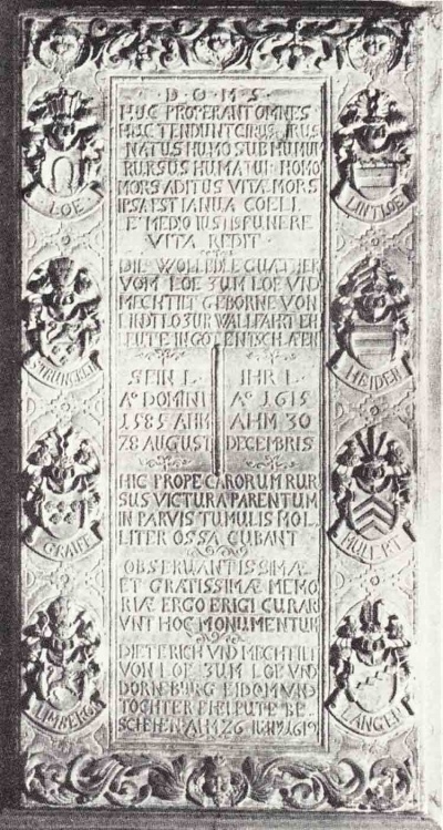8. Mechtild, + (Haus Loe) 1615 Dez 30, Epitaph in der Kirche St. Georg zu Marl mit vier Ahnenwappen.